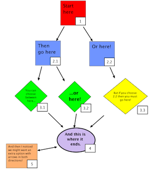 The picture on the left shows a flow chart diagram created with Strõm. The connections between the shapes have arrow heads attached to them; a new feature in Strõm 1.2.
